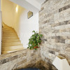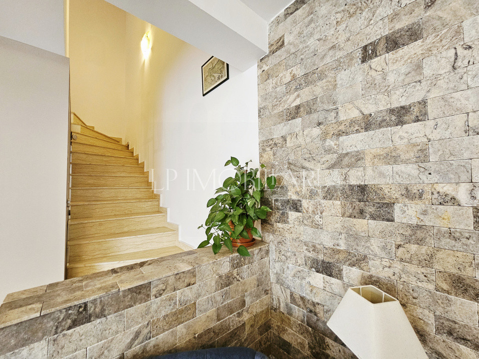 Parchet natural din stejar, scara interioara pavata cu granit, tamplarie din aluminiu cu geam dublu si glafuri din granit, obloane exterioare actionate electric.